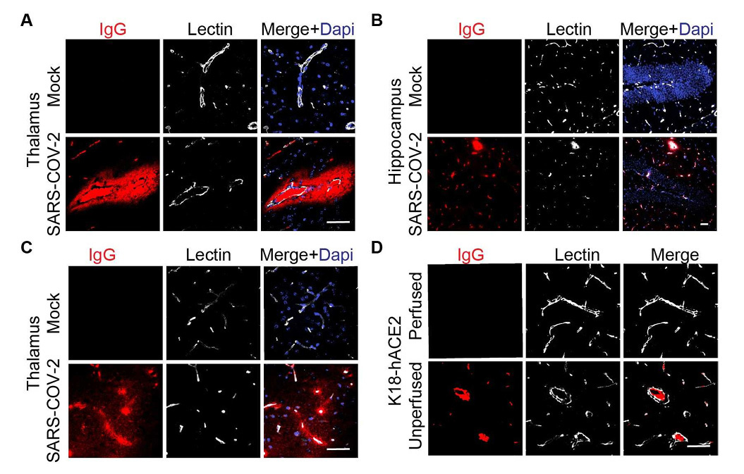 Our study further indicated that the structural changes in cerebral microvessels and BBB are key pathological phenomenon during SARS-CoV-2 infection in the K18-hACE2 infection model. We reported a notable rise in the occurrence of microhemorrhages in the mouse brain infected with SARS-CoV-2. In areas without microhemorrhages, we also noted a substantial increase in IgG extravasation, particularly in the cortex, thalamus, and hippocampus. This underscores the significant impact of SARS-CoV-2 on microhemorrhages and emphasizes its impact on BBB integrity. Nevertheless, the current research remains limited on this direction, and future studies are still urgently needed to explore the fundamental biology in models with mild infection and long-COVID scenarios, and determine to what extent the breakdown of the brain barriers may contribute to the neurological complication in the development of PASC.