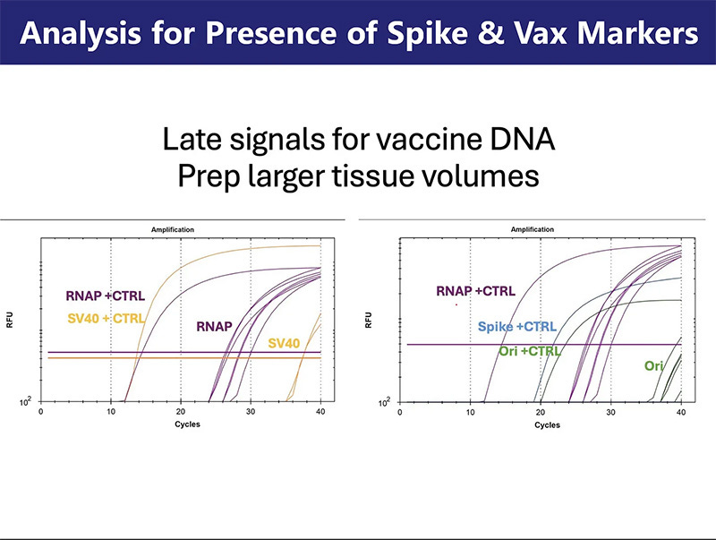 Slide 19: qPCR amplification plots demonstrating detection of human reference genes (RNAP), viral spike sequences, and plasmid vector markers (SV40 and Ori) from clot-derived tissue extracts. Amplification curves show positive detection of RNAP confirming the human origin of the sample. Late-cycle amplification signals for SV40 promoter, spike protein coding sequence, and Ori (origin of replication) suggest low-abundance presence of residual plasmid DNA consistent with LNP-based recombinant vaccine components. Controls were included for all primer sets. These results indicate preliminary molecular evidence for incorporation or association of spike vaccine-related material within the clot matrices.