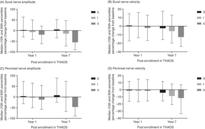 Median (10th and 90th percentile) percentage change from baseline in sural and peroneal nerve conduction by latest mPND score in patients with ATTRv amyloidosis and nerve conduction studies. mPND score IIIa, IIIb, and IV values are either not available (no patients with data) or not shown due to low n (n = 1). Data from year 8 not shown due to small number of patients in certain subgroups. ATTRv, hereditary transthyretin amyloidosis; mPND, modified polyneuropathy disability; THAOS, Transthyretin Amyloidosis Outcomes Survey