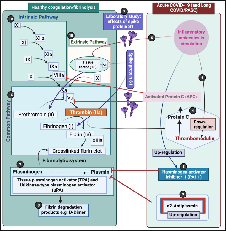 (1A) The intrinsic and (1B) extrinsic pathways converge into the (1C) common pathway. These pathways lead to the conversion of soluble fibrinogen to insoluble fibrin, catalyzed by thrombin. (2) Tissue plasminogen activator (tPA) or urokinase-type plasminogen activator (uPA) converts plasminogen into plasmin. A healthy fibrinolytic system regulates the coagulation pathway and assists with successful lysis of the insoluble fibrin clot. (3) Plasmin cleaves fibrin into fibrin degradation products (FDPs), including D-dimer. (4) Protein C and thrombomodulin both regulate coagulation: thrombin binds to its receptor, thrombomodulin, resulting in activated protein C (APC). APC then inhibits both Va and VIIIa. (5) Dysregulated inflammatory molecules may interfere with tissue factor (TF) expression. (6) Dysregulated inflammatory molecules may also down-regulate thrombomodulin, resulting in hypercoagulation, as Va and VIIIa activities are then not sufficiently modulated. (7) In our laboraoty suty, we added Spike protein S1 to healthy plasma. Pathophysiology was noted in both prothrombin and fibrinogen chains. (8) Dysregulated inflammatory molecules in circulation can inhibit of the fibrinolytic system via up-regulation of plasminogen activator inhibitor-1 (PAI-1). PAI-I up-regulation interferes with tPA function, and ultimately results in a dysregulated coagulation system. (9) α2AP inhibits plasmin and ultimately will prevent sufficient fibrinolysis to happen. (Figure created with Biorender.com).