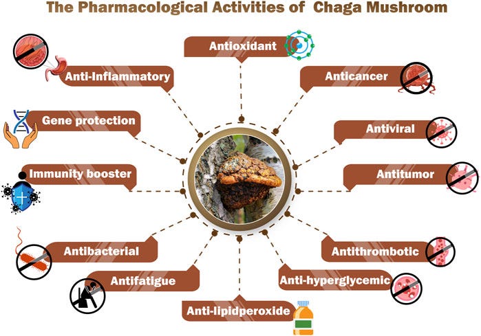 Thank you for the write-up Walter... really good stuff! I recall in the earliest days of the "official" pandemic, very early 2020, Cliff High was reporting that he was hearing from a traditional Chinese herbalist in the Wuhan region that his clients who were taking his formulations (via tea I think) that contained Chaga, even those who were elderly, seemed to be well protected from the effects of the virus. This was before Dr. Zelenko was even talking about HCQ. I ordered a large batch sourced from Northern MI and have kept it on-hand ever since. I think that mushrooms in general, and these tree concs like Chaga, Turkey tail, and Agaricon, are powerful immune boosting medicinals that we need to study more...