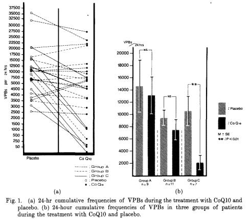 A Japanese study, quoted in the initial graphic, demonstrated that, indeed CoQ10 significantly reduced Ventricular Premature Beats, a common arrythmia.