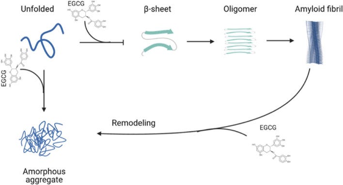 Epigallocatechin-gallate (EGCG) interferes in different steps of amyloid formation. EGCG can bind to unfolded monomers and inhibit the formation of amyloid fibrils or amorphous aggregates. It also is able to remodel amyloid fibrils to form amorphous aggregates.
