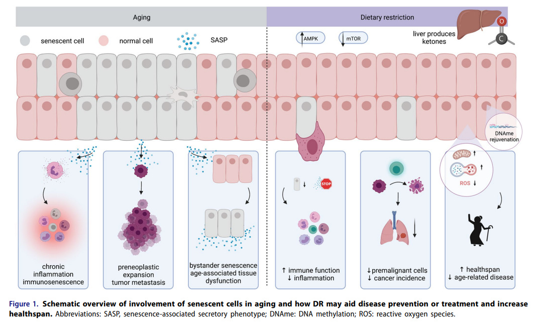 There is increasing evidence that Dietary Restriction (DR) reduces the accumulation of senescent cells and improves healthspan and lifespan. We propose that DR-associated senolysis may be achieved in part via metabolic reprogramming and epigenetic rejuvenation (summary and graphical overview in Figure 1, above). While we welcome the increasing interest in dietary, non-pharmacological approaches in longevity and prevention research, we emphasize the urgent requirement for further research to fully understand both the beneficial and potential harmful effects, including to future generations of offspring, and to further dissect the underlying molecular mechanisms. In particular, many preclinical studies to date have been carried out on male animals only, and more needs to be done to understand the effects of DR in females in relation to sex hormones and their fluctuation.