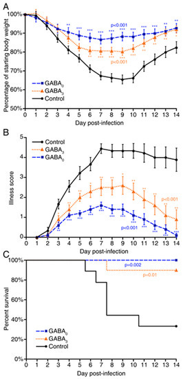 In terms of illness, MHV-1-infected control mice began to display signs of illness two days post-infection and rapidly became severely ill thereafter, with their illness peaking around day 7 post-infection (Figure 1B and Supplemental Figure S2). In contrast, the mice receiving GABA immediately after MHV-1 inoculation developed only mild illness. Illness scores in the mice given GABA at 3 days post-infection was also significantly reduced compared to that in the control group (Figure 1B and Supplemental Figure S2). Thus, GABA treatment immediately after MHV-1 infection, or 3 days later when the clinical signs of the disease were apparent, reduced the severity of the disease.