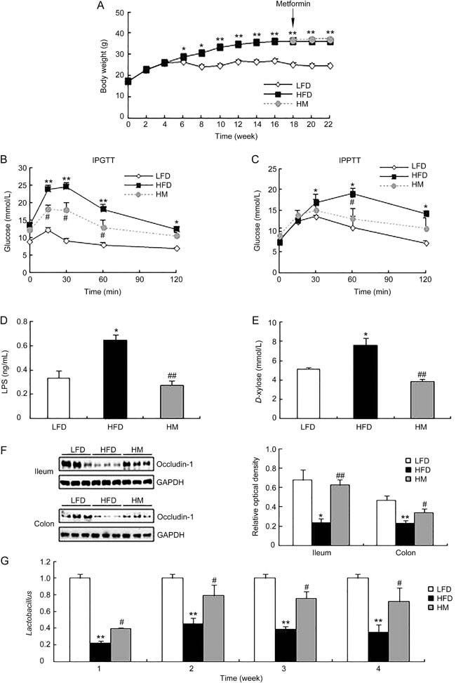 Metformin improves glucose metabolism and attenuates endotoxemia. Mice were fed an LFD or HFD for 18 weeks, and then a set of HFD-fed mice were treated with metformin for another 4 weeks. (A) Body weight; (B) Glucose tolerance test (IPGTT); (C) Pyruvate tolerance test (IPPTT); (D) Serum LPS contents; (E) Serum D-xylose contents; (F) Western blot analysis of gut occludin-1 contents; (G) Quantitative real-time PCR analysis of gut lactobacillus. Mean±SEM. n=4–6. *P<0.05, **P<0.01 vs LFD. #P<0.05, ##P<0.01 vs HFD.