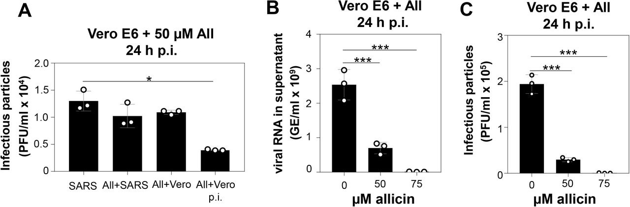 Allicin treatment of SARS-CoV-2 infected Vero E6 cells inhibits viral replication.(A-C) Vero E6 cells were infected with SARS-CoV-2 at a MOI of 0.01. After 24 h p.i. viral replication was analyzed by determination of infectious viral particles or viral RNA in the supernatant. (A) Comparison of different allicin treatment options: Untreated Vero E6 cells infected with SARS-CoV-2 as control (SARS), SARS-CoV-2 pre-treated with 50 μM allicin for 30 min prior to infection of host cells (All+SARS), host cells pre-treated with 50 μM allicin for 30 min prior to infection with SARS-CoV-2 (All+Vero) and SARS-CoV-2 infected host cells treated with 50 μM allicin p.i. (All+Vero p.i.). Allicin treatment p.i. significantly decreased the number of infectious viral particles. (B, C) The amount of viral RNA (B) and infectious viral particles (C) was determined after treatment of SARS-CoV-2 infected Vero E6 cells with 50 and 75 μM allicin p.i. Increased allicin doses significantly inhibit SARS-CoV-2 replication. The results A-C are from 3 biological replicates with 2 technical replicates for B. Error bars represent the SD. p-values were calculated using an unpaired two-tailed t-Test.*p<0.05. ***p<0.001.
