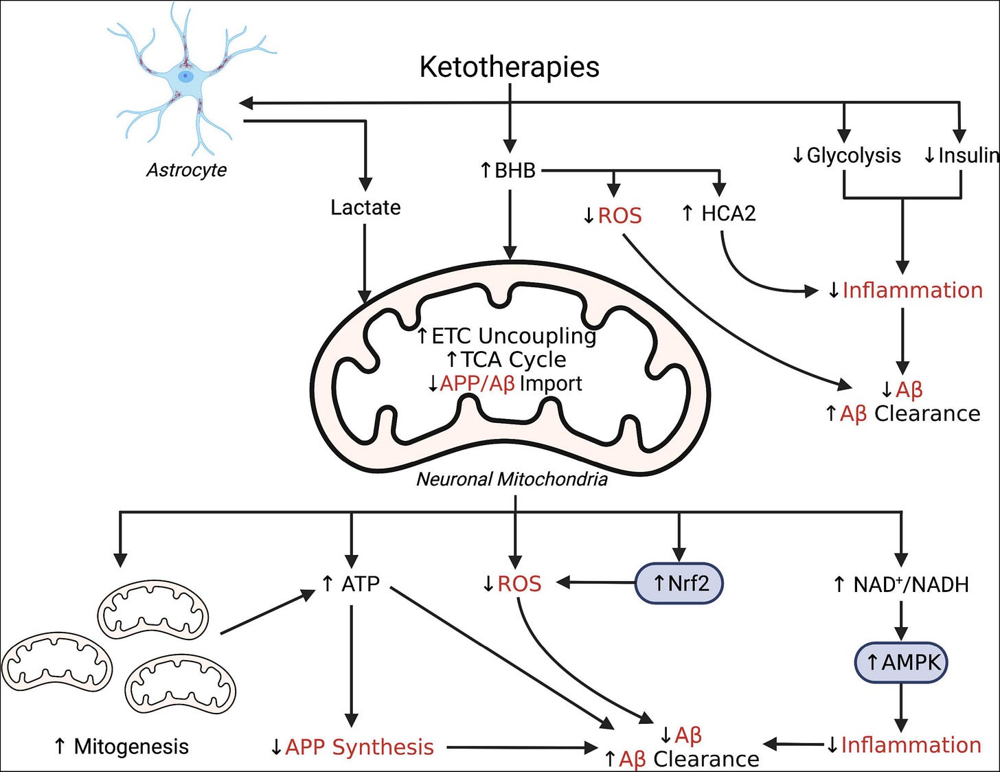 Simplified schematic illustrating putative pleiotropic effects of ketotherapies as modulators of amyloid-β. Ketotherapies (KTs) potentially modulate amyloid-β (Aβ) through various direct and indirect mechanisms targeting poor mitochondrial bioenergetics, increased ROS, and increased inflammation. KTs, especially the ketogenic diet (KD), reduce systemic insulin and potentially improve peripheral metabolic status which may improve systemic inflammation and reduce Aβ. The ketone body, β-hydroxybutyrate (BHB), serves as an energy substrate for mitochondrial metabolism, upregulates the astrocyte-neuron lactate shuttle, activates hydrocarboxylic acid receptor 2 (HCA2) to regulate inflammation, and may directly scavenge reactive oxygen species (ROS). Through bioenergetic effects in the mitochondria, KTs stimulate genesis of new mitochondria, increase uncoupling of the electron transport chain (ETC) to increase ATP production, generate less ROS than glucose metabolism, and reduce mitochondrial import of amyloid precursor protein (APP) and Aβ. KTs also activate nuclear factor-E2 related factor 2 (Nrf2) to upregulate synthesis of ROS-scavenging antioxidants and AMP-activated protein kinase (AMPK) to regulate transcription of pro-inflammatory cytokines.