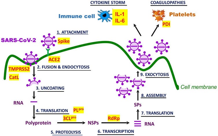 Molecular and physiological targets of quercetin and isoquercetin in Covid-19. SARS-CoV-2 infection and life cycle are graphically represented. Potential targets for inhibition by the flavonols are written in red and highlighted in yellow. Their full identity and the role in Covid-19 pathogenesis are described in the text. NSPs stand for non-structural proteins, and SPs for structural proteins.