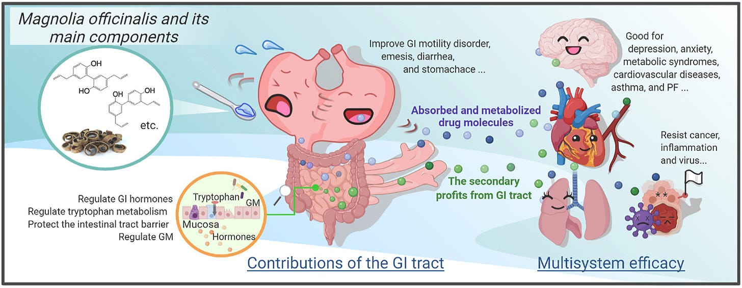 Magnolia officinalis Cortex has plenty of pharmacological activities and gastrointestinal (GI) tract contributes a lot to it. In addition to rich gastrointestinal activity, Magnolia officinalis can also exert multisystem efficacy through GI absorption and transport or secondary effects based on intestinal effects.