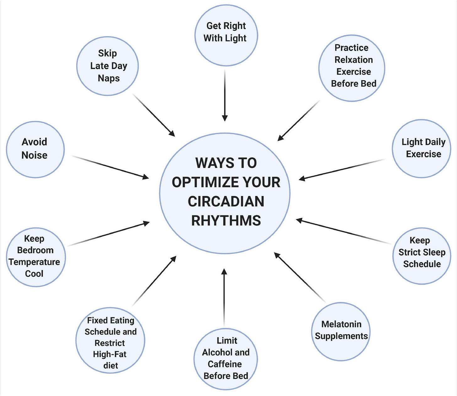 Ways to optimize your circadian rhythms. Light is one of the most important regulators of the circadian rhythms. Chronic exposure to light, particularly to shorter wavelengths (like blue and green), at nighttime inhibits sleep-inducing neurons and decrease melatonin secretion. Naps later during the day usually comprise deep sleep (slow-wave), when there is a natural decline of our energy, and this interferes with nighttime sleep. Hot and humid temperatures increase wakefulness, reduced REM and slow-wave sleep. However, cooler temperatures between 13 to 23°C do not interfere with any of the sleep stages. Noisy environments can also interfere with deep sleep thus a quiet environment is preferred. Food intake at an inappropriate time of the day disrupts the coordinate function of circadian rhythms between the central and the peripheral organs resulting in metabolic imbalances. Alcohol, caffeine, or nicotine should be avoided at least 4 h before bedtime as it is associated with a fragmented sleep pattern. Relaxation exercises before bedtime can help lower heart rate, blood pressure, and reduce sympathetic nervous system activation, which facilitates sleep. Stimulating activities or exercise leads to alteration of the circadian functioning by changing the expression of clock genes and creates shifts in the timing of melatonin rhythms in humans. Melatonin supplements can also help fall asleep, especially during insomnia or jet lag. Adhering to a strict sleep schedule is also important that can help strengthen the circadian rhythms.