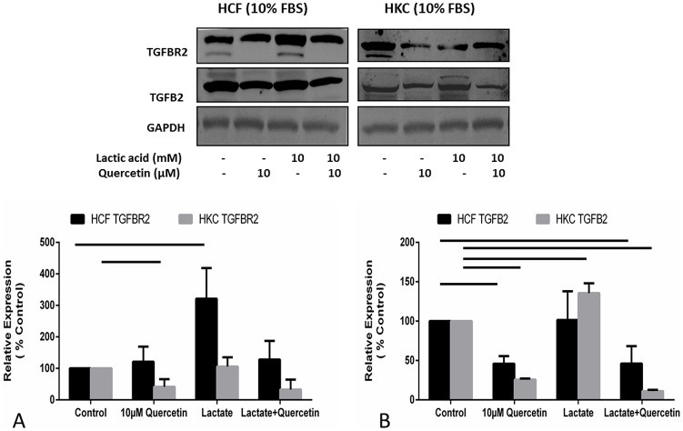 (A) TGF-βRII expression was significantly up regulated in HCFs following lactate stimulation (p < 0.05) and down regulated in HKCs following Quercetin stimulation (p < 0.05), (B) TGF-β2 expression was significantly up regulated in HKCs following Lactate stimulation (p < 0.05) where HCFs showed no differences. Quercetin stimulation led to significant down regulation of TGF-β2 expression in both HCFs and HKCs. All gels have been run under the same experimental conditions. n = 3, error bars represent SEM.