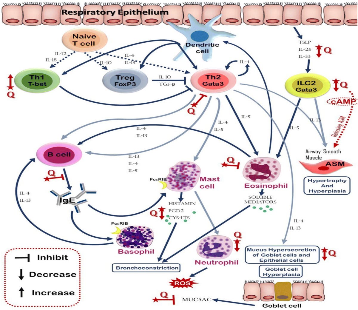 Different effects of quercetin on immune cells involved in asthma.