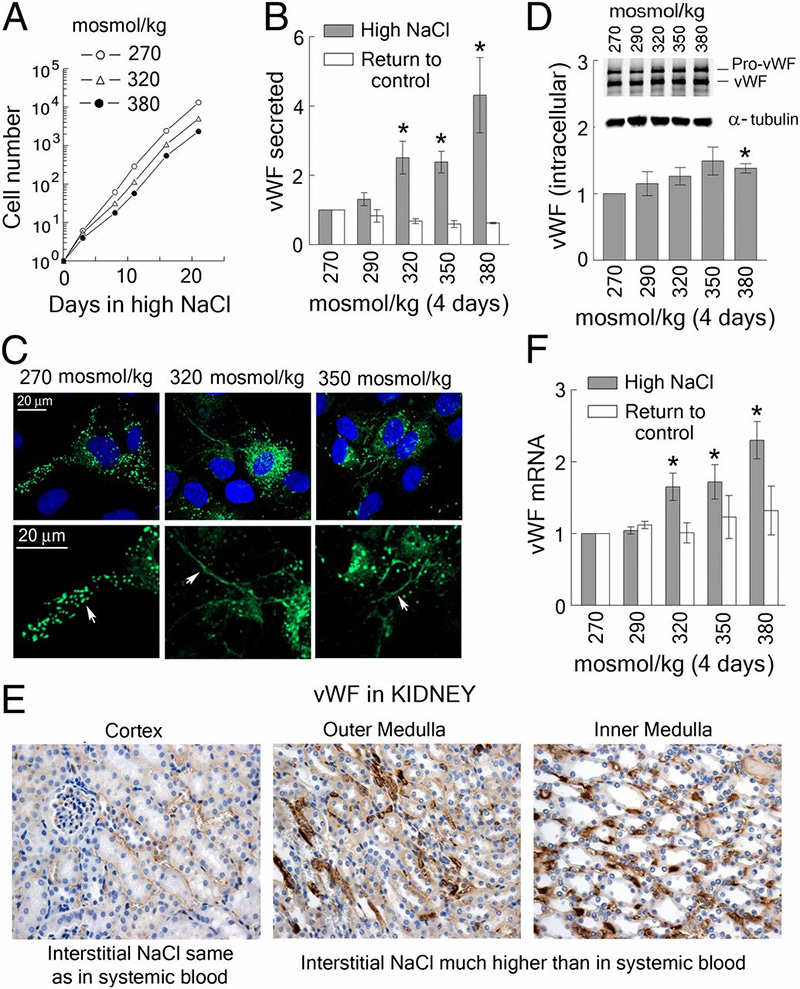 High NaCl increases production and secretion of vWF from vascular endothelial cells. (A–D and F) HUVECs were exposed to media in which NaCl was elevated for 4 d to the total osmolality indicated in the figure panels. (A) HUVECs adapt to the range of elevated NaCl that occurs in hypernatremia, maintaining logarithmic growth (see also Fig. S2A for images of the cells). (B) High NaCl increases secretion of vWF, but when the elevated NaCl is lowered to the control level (270 mosmol/kg) for 2 d vWF secretion returns to its control level (mean ± SEM, *P < 0.05, t test, n = 5, linearly dependent on NaCl concentration, P = 0.0009). (C) At 270 mosmol/kg vWF multimers are compactly stored in Weibel–Palade bodies (arrow), but when NaCl is increased for 4 d the cells release long fibers of uncondensed vWF multimers (arrow). Green, vWF; blue, nuclei stained with DAPI. The lower panel is a higher magnification of the upper panel. (D) High NaCl has little effect on the level of intracellular vWF protein. (Upper) Representative Western blot image. (Lower) Quantification, relative to 270 mosmol/kg, normalized to tubulin (mean ± SEM, *P < 0.05, t test, n = 3). (F) High NaCl increases vWF mRNA in HUVECs. vWF mRNA level returns to the basal when NaCl is lowered for 2 d (mean ± SEM, *P < 0.05, t test, n = 5, linearly dependent on NaCl concentration, P < 0.0001). (E) vWF protein is higher in the kidney medulla, where interstitial NaCl is very high, than in kidney cortex, where the interstitial concentration of NaCl is similar to that in systemic blood. Immunohistochemical staining for vWF (brown). See also Fig. S2C for colocalization with CD31staining (endothelial cell marker).