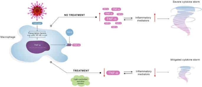 Photosynthetically Controlled Spirulina, but Not Solar Spirulina, Inhibits TNF-α Secretion: Potential Implications for COVID-19-Related Cytokine Storm Therapy