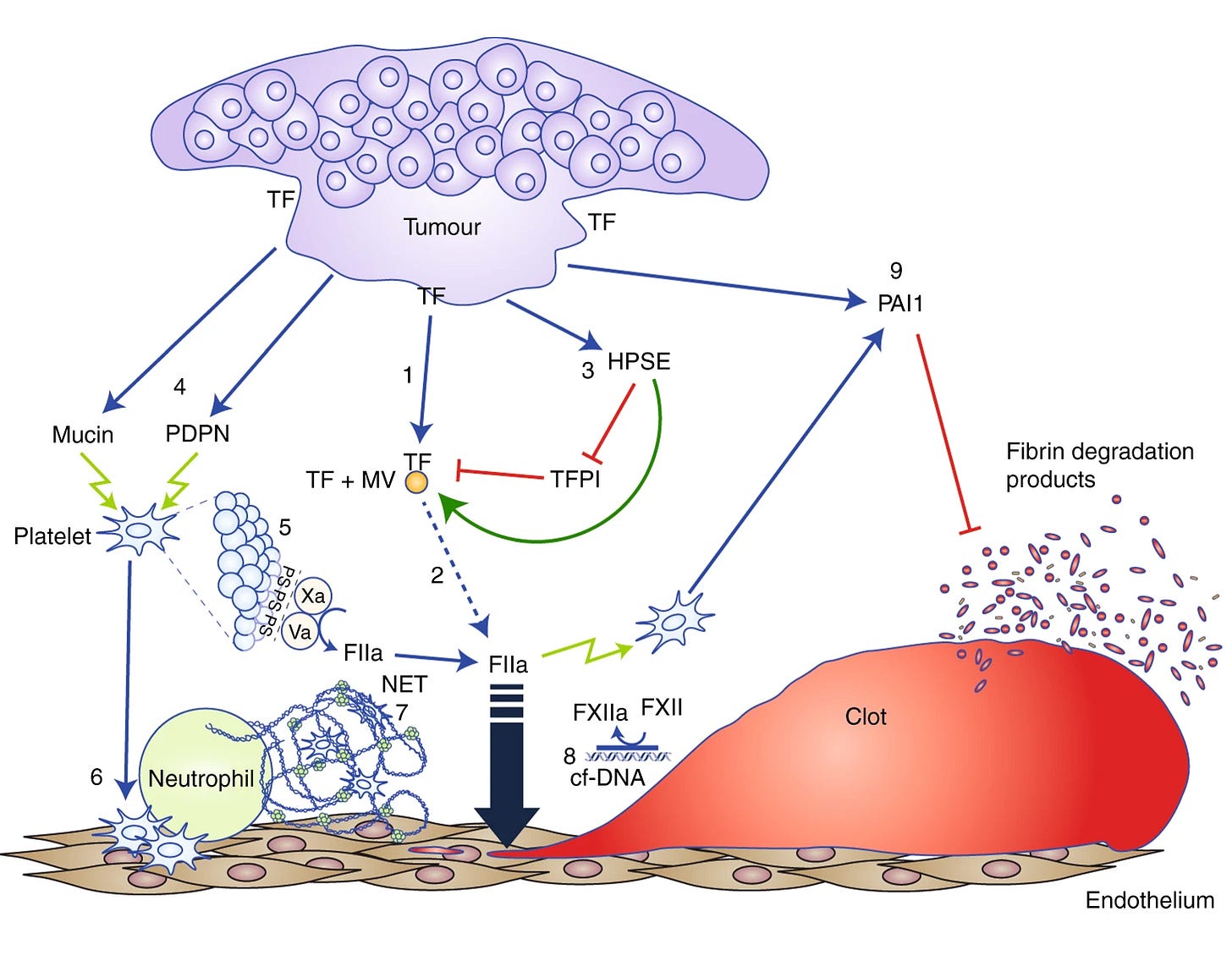 Pancreatic cancer is characterised by high tumoural expression of tissue factor, activation of leukocytes with the release of neutrophil extracellular traps, the dissemination of tumour-derived microvesicles that promote hypercoagulability and increased platelet activation. Furthermore, other coagulation pathways probably contribute to these processes, such as those that involve heparanase, podoplanin and hypofibrinolysis.