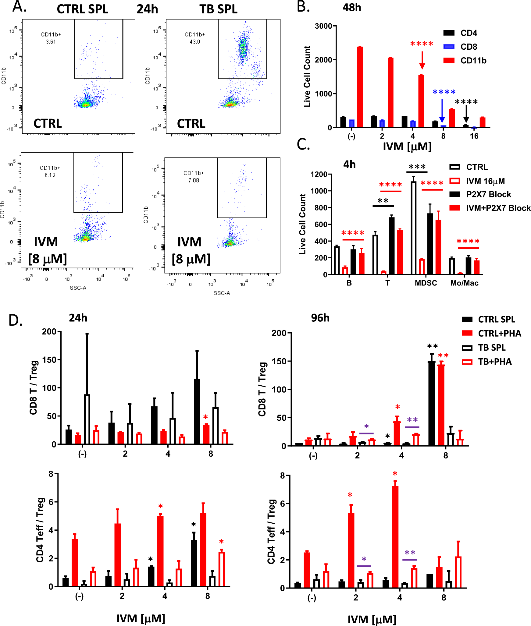 The release and accumulation of high levels of extracellular ATP has emerged as a key characteristic feature of the tumor microenvironment, and a hallmark of Immunogenic Cell Death (ICD). We and others have previously shown that ivermectin is a positive allosteric modulator of purinergic signaling and the ATP/P2X4/P2X7/Pannexin-1 axis which operates in both cancer and immune cells. In murine splenocytes treated ex vivo, we showed that ivermectin can selectively target various immune subpopulations in a P2X7-dependent fashion and has immune-potentiating activities associated with augmented ratios of immune effectors versus immunosuppressive populations, including Tregs and myeloid cells.