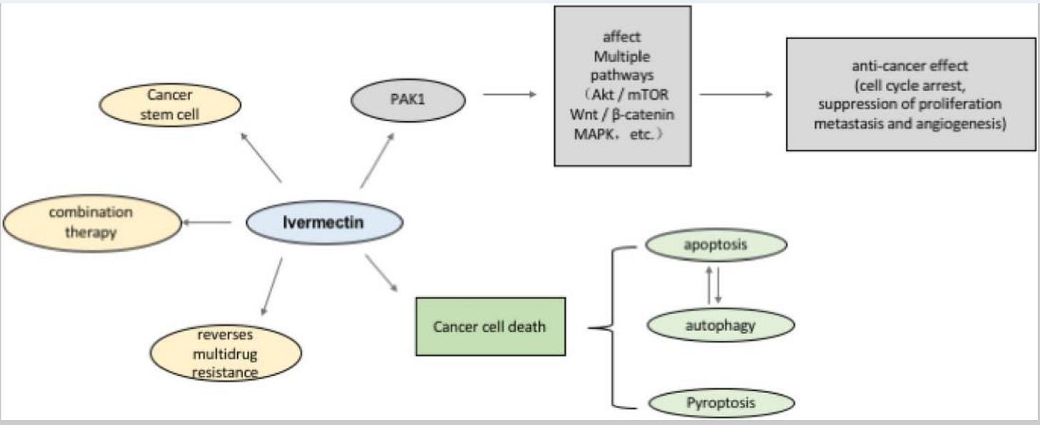 Recent studies have also found that IVM could promote the death of tumor cells by regulating the tumor microenvironment in breast cancer. Under the stimulation of a tumor microenvironment with a high level of adenosine triphosphate (ATP) outside tumor cells, IVM could enhance the P2 × 4/ P2 × 7/Pannexin-1 mediated release of high mobility group box-1 protein (HMGB1) [37]. However, the release of a large amount of HMGB1 into the extracellular environment will promote immune cell-mediated immunogenic death and inflammatory reactions, which will have an inhibitory effect on the growth of tumor cells. Therefore, we believe that the anticancer effect of IVM is not limited to cytotoxicity, but also involves the regulation of the tumor microenvironment. IVM regulates the tumor microenvironment and mediates immunogenic cell death, which may be a new direction for research exploring anticancer mechanisms in the future.