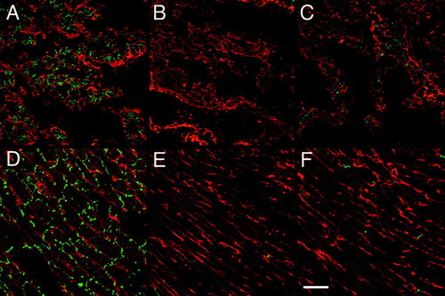Immunofluorescent staining for Cx43 in wild-type and MHC-CKO hearts. Sections from E12.5 (A through C) and 4-week-old (D through F) hearts were stained for Cx43 (green fluorescent stain), counter-stained using wheat germ agglutinin (red fluorescent stain), and imaged with confocal microscopy. Abundant Cx43 staining in control littermate hearts is evident at both embryonic (A) and postnatal (D) stages. In contrast, extensive areas of the myocardium in embryonic (B and C) and postnatal (E and F) CKO mice are devoid of Cx43 staining, although some residual expression is detectable. Bar=50 μm.