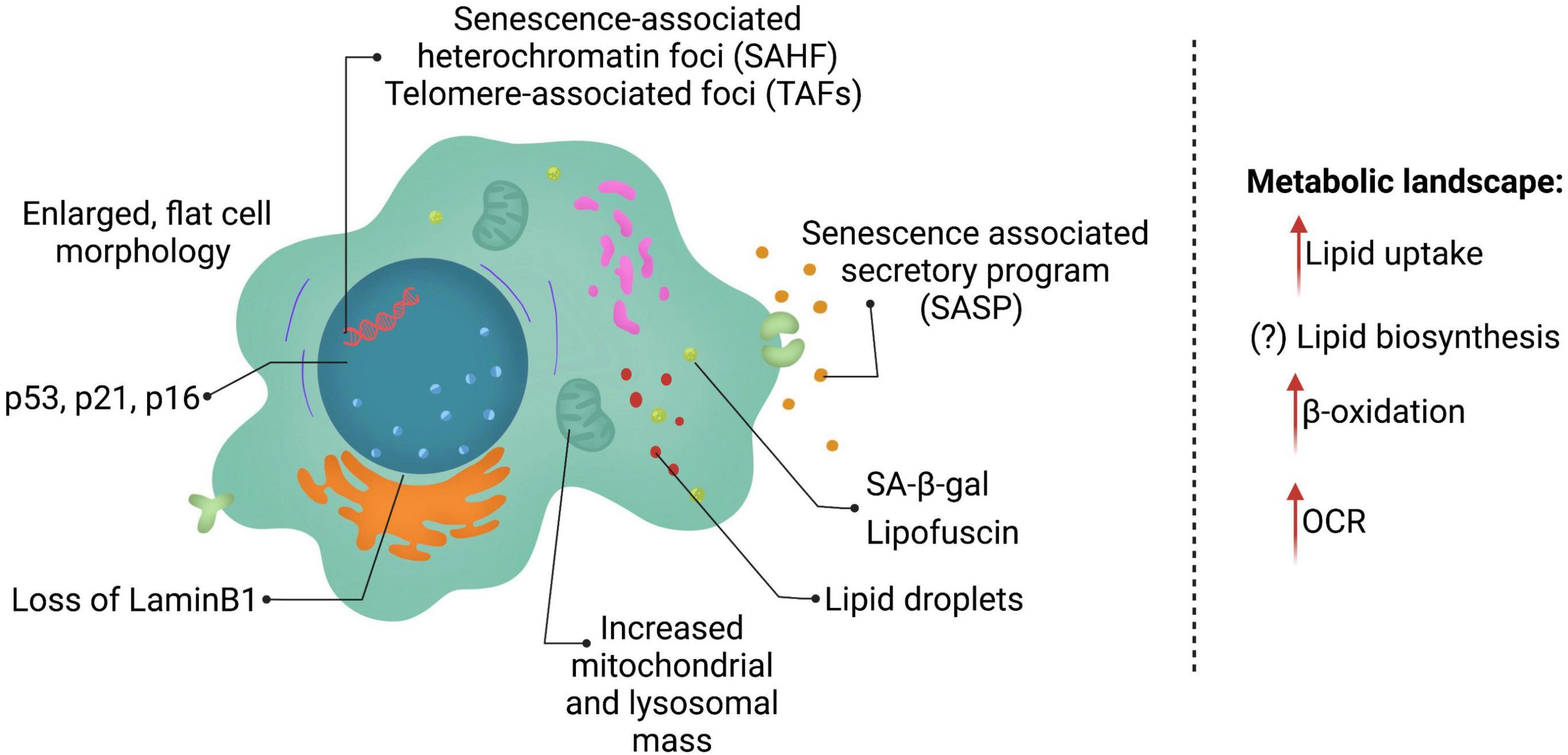 Lipids are key macromolecules that perform a multitude of biological functions ranging from maintaining structural integrity of membranes, energy storage, to signaling molecules. Unsurprisingly, variations in lipid composition and its levels can influence the functional and physiological state of the cell and its milieu. Cellular senescence is a permanent state of cell cycle arrest and is a hallmark of the aging process, as well as several age-related pathologies. Senescent cells are often characterized by alterations in morphology, metabolism, chromatin remodeling and exhibit a complex pro-inflammatory secretome (SASP). Recent studies have shown that the regulation of specific lipid species play a critical role in senescence. Indeed, some lipid species even contribute to the low-grade inflammation associated with SASP. Many protein regulators of senescence have been well characterized and are associated with lipid metabolism.