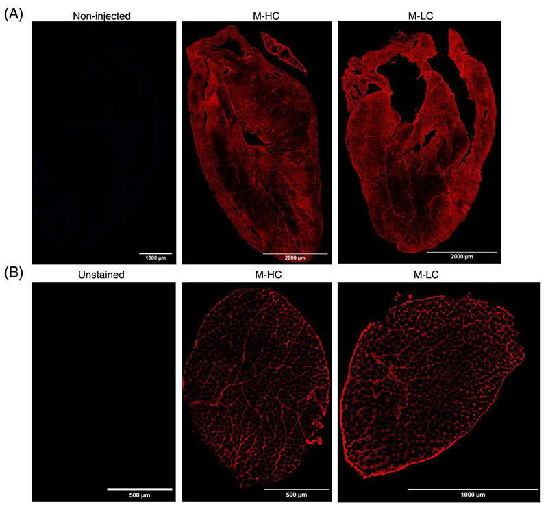 Injected human IgG (hIgG) of Long COVID (LC) patients and healthy donors (HC) localizes in murine heart and skeletal muscles. (A) Representative staining of hIgG (red) in the heart of M-HC (middle panel) and M-LC (right panel). As a negative control, hearts of non-injected mice were included and stained for the presence of hIgG (left panel). (B) Representative staining of hIgG in skeletal muscle of M-HC (middle panel) and M-LC (right panel). As a negative control, unstained skeletal muscle was taken along (left panel).