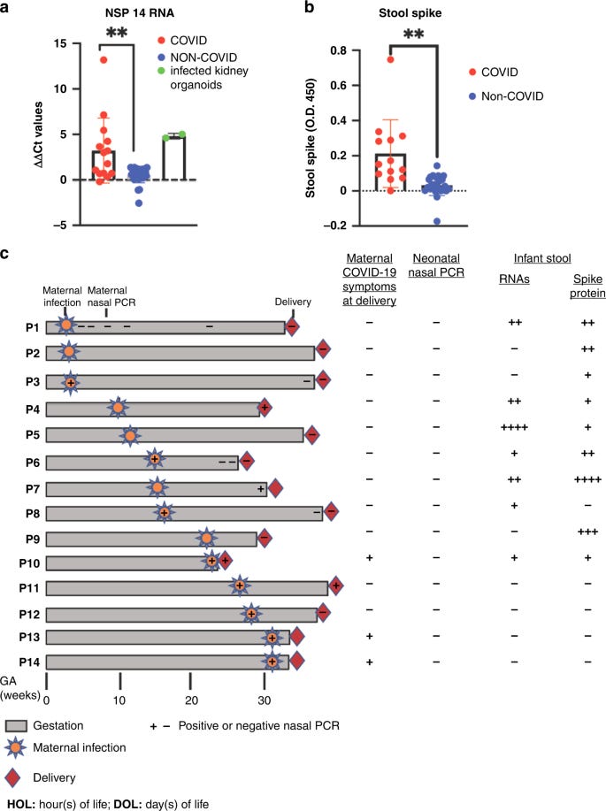 Concerns over Spike Protein persisting in the stool of newborns born to asymptomatic mothers, combined with mRNA transplacental transmission.