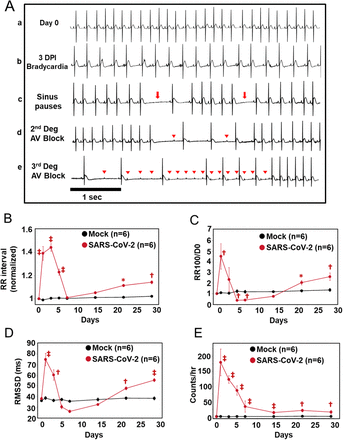 Representative ECG recording showing normal baseline rhythm (a) and arrhythmias induced by SARS-CoV-2 infection including bradycardia (b), sinus pauses (c, arrows), 2nd degree AV block (d) and 3rd degree AV block (e). Arrowheads indicate p waves. Horizontal bar: 1 sec. (B-E) Analysis of ECGs from 0 to 28 dpi typically showed a triphasic pattern of SARS-CoV-2 effects on cardiac rhythm: an acute peak within 7 dpi, recovery to, or below, baseline, and a long-term effect developing between 7 dpi and 28 dpi. Mean RR interval (normalized to D0) (B), incidence of long sinus pauses (RR>meanRR+100ms; normalized to D0) (C), and RMSSD (D) peaked at 1-3 dpi, and returned to levels close to or lower than baseline, and then gradually increased to levels significantly higher than baseline at 21 and 28 dpi. The rate of AV Block events (E) peaked early and did not return to baseline level, remaining significantly higher than baseline between 7 and 28 dpi. Red symbols denoting p-values * p<0.05; † p<0.01; ‡ p<0.0001 on the figures compare mock vs. SARS-CoV2 infected groups. P-values comparing SARS-CoV-2 data from day 0 through day 28 are available in Supplementary table 4.