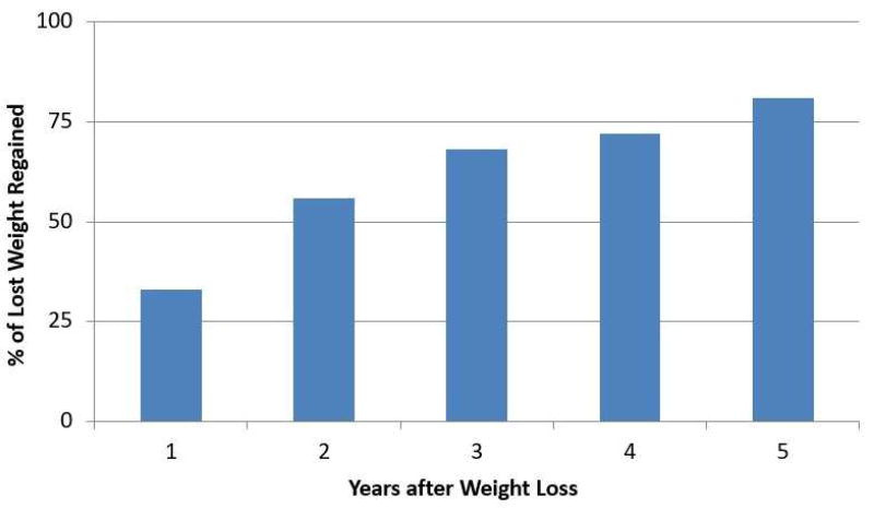From a purely calorie balance perspective, a patient who maintains lost weight after the first year of an intervention may be eating only about 100 kcal/d fewer than a patient who experiences long-term weight regain. However, such a small difference in food intake behavior is somewhat misleading considering that prevention of weight regain requires about 300–500 kcal/d of increased persistent effort to counter the ongoing slowing of metabolism and increased appetite associated with the lost weight. The more typical pattern of long-term weight regain is characterized by a waning effort to sustain the intervention.