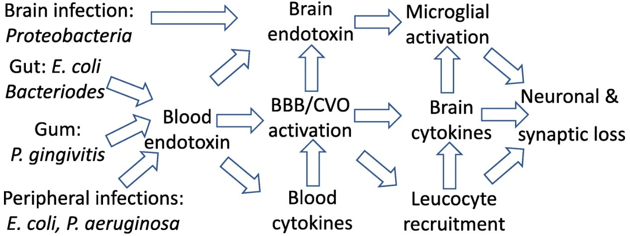 Different species of endotoxin arise from different sources, ending up in the blood or brain. Blood endotoxin increase pro-inflammatory cytokines in blood, and inflammatory activates the blood-brain barrier (BBB) and circumventricular organs (CVO), recruiting leucocytes into the brain and increasing brain cytokines that activate microglia, resulting in synaptic and neuronal loss.
