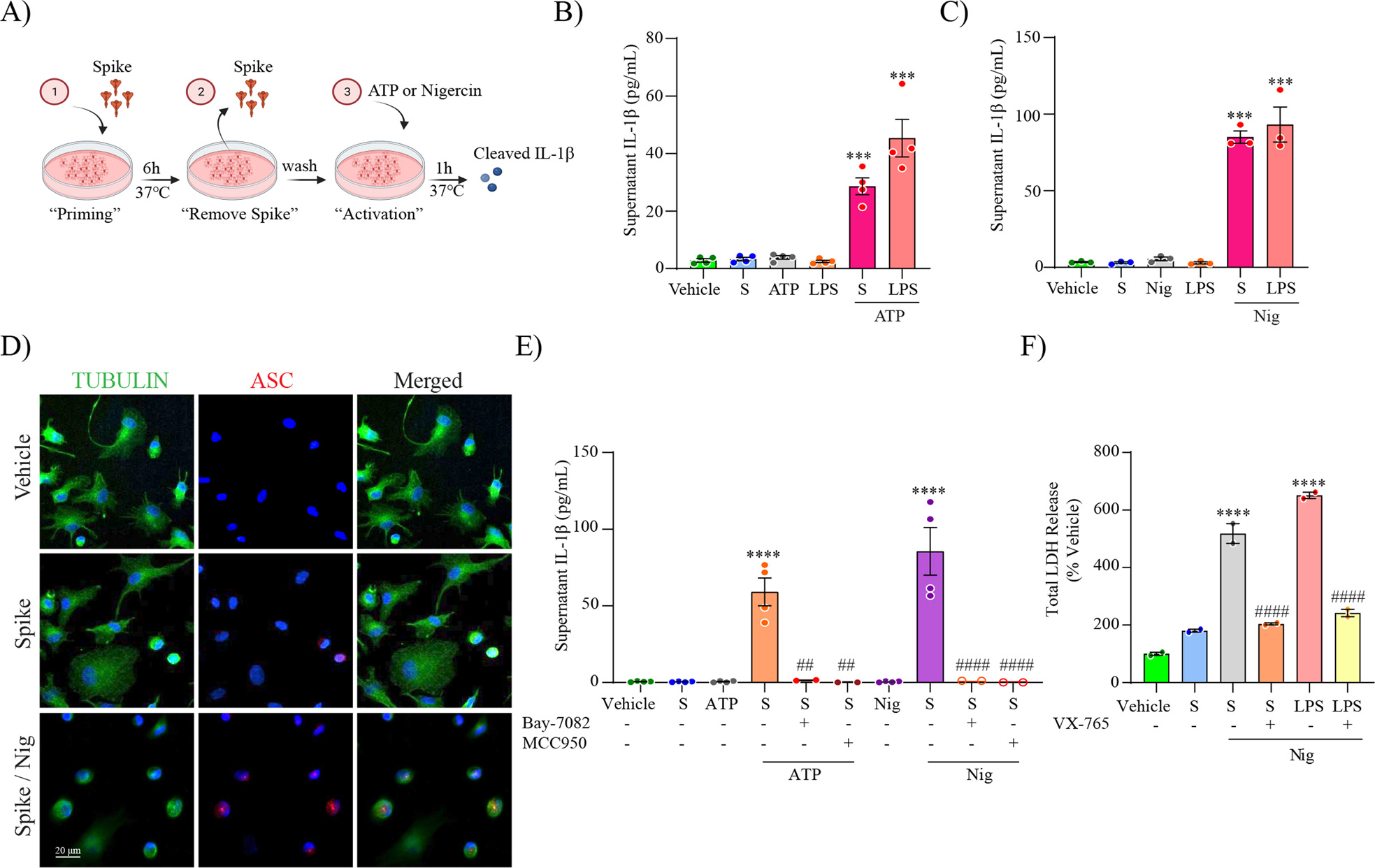 Schematic representation for spike priming experiments (6 h) followed ATP or Nigericin (Nig) activation (1 h) (A). Level of secreted IL-1β in unprimed or S-clamp-primed MDMi (S; 50 μg 6 h) followed activation with ATP (5 mM, 1 h) in (B) or Nigericin (Nig; 10 μM, 1 h) in (C). In both LPS-primed cells were used as a positive control (200 ng/ml 3 h). Immunofluorescence staining of vehicle or S-clamp (S; 50 μg 6 h)–primed MDMi, activated with Nigericin (Nig; 10 μM, 1 h) showing tubulin (green) and the formation of a characteristic inflammasome ASC speck (red) are shown in (D). Scale bar 20 μm. ATP and Nigericin–mediated IL-1β secretion (supernatant) in vehicle (untreated) or S-clamp-primed MDMIs exposed to ATP (5 mM, 1 h) or Nigericin (Nig; 10 μM, 1 h) in presence or absence of Bay 11-7082 (3 μM) or MCC950 (10 μM) are shown in (E). Lactate dehydrogenase (LDH) release assay for quantification of caspase-1–dependent pyroptosis in S-clamp (S; 50 μg 6 h) primed cells activated with Nigericin (Nig; 10 μM, 1 h) in (F). LPS-Nigericin and VX-765 (20 μM) were used as positive controls. Data are means ± SEM from at least 3 independent donors. ***P < 0.001 and ****P < 0.0001 by one-way analysis of variance (ANOVA) with Tukey’s post hoc test.