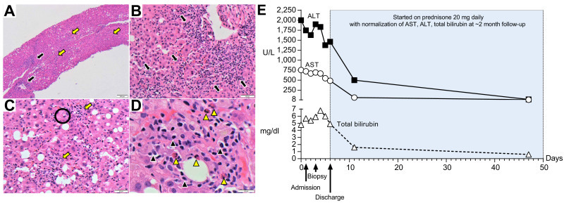 (A) Low-magnification (40x) shows pan-lobular hepatitis (black arrows: portal inflammation and yellow arrows: lobular inflammation). (B) Medium-magnification images (200x) show a portal tract with an intense lymphoplasmacytic infiltrate effacing the interface with rosette formation and (C) lobular activity with scattered hepatocyte necrosis (Black circle: acidophilic bodies). (D) At high magnification (600x), the inflammation consists primarily of lymphocytes with plasma cells (black arrowheads) and eosinophils (yellow arrowheads). (E) Trends of plasma ALT, AST and total bilirubin over time.