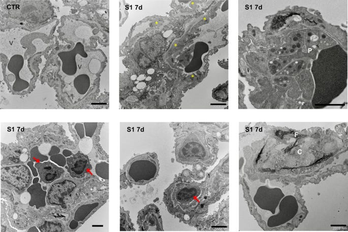 S1 injection induces endothelial ultrastructural changes in lung tissue of hACE2-KI mice. Ultrastructural analysis of lung alveolar tissue from CTR and S1-injected mice at 7d. In CTR mice, thin vascular endothelial cells form the inner lining of alveolar capillary (V). Mice injected with S1 at 7d show areas of thickening of endothelial cells (yellow asterisks), associated with activated platelets (P), inflammatory cell accumulation (red arrows), including neutrophils and monocytes, and material with fibrillar aspect (F) and collagen (C) deposition. Scale bars: 2000 nm.
