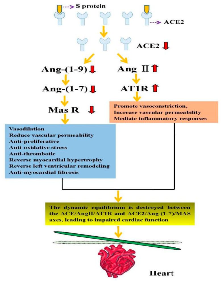 The direct mechanism of cardiac injury caused by SARS-CoV-2 using ACE2 as the target. Angiotensinogen is converted to Ang I by renin. Angiotensin-converting enzyme (ACE) can convert Ang I into Ang II, which in turn can activate the angiotensin II type 1 receptor (AT1R). ACE2 can cleave Ang I to produce the Ang-(1-9) peptide, which can then be converted into the vasodilator peptide Ang-(1-7) through ACE or other peptidases. Conversely, ACE2 can hydrolyze Ang II into Ang-(1-7), which acts on Mas receptors. When the SARS-CoV-2 S protein binds to ACE2 receptors, the dynamic equilibrium is destroyed between the ACE/Ang II/AT1R and ACE2/Ang-(1-7)/MAS axes, leading to impaired cardiac function.