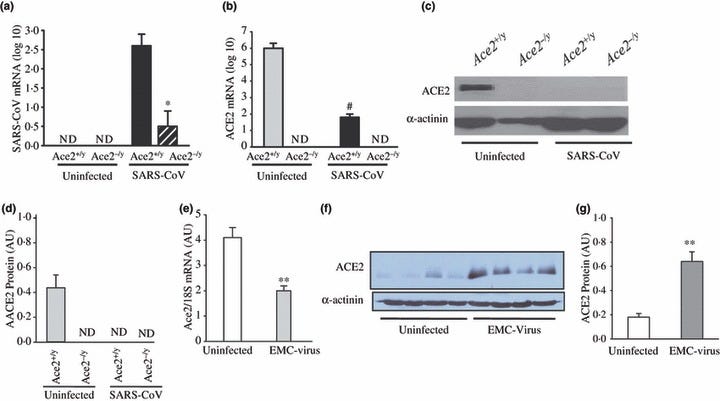 Pulmonary SARS‐CoV infection leads to myocardial SARS‐CoV infection and down‐regulation of myocardial ACE2 expression. (a–d) Human SARS‐CoV mRNA in the hearts of infected mice showing a clear dependence on ACE2 for myocardial SARS‐CoV infection (a) with down‐regulation of myocardial Ace2 mRNA expression based on real‐time PCR (b) and myocardial ACE2 protein levels shown by Western blot analysis (c) and quantification (d) in response to pulmonary SARS‐CoV infection. *P < 0·01 compared with infected Ace2+/y group; #P < 0·01 compared with uninfected group, n = 5, ND, not detectable. (e–g) Discordant changes in myocardial Ace2 mRNA and myocardial ACE2 protein levels in encephalomyocarditis (EMC) virus‐induced myocarditis with real‐time PCR showing reduced myocardial Ace2 mRNA (e) with increased myocardial ACE2 protein levels based on Western blot analysis (f) and quantification (g). **P < 0·01 compared with placebo group, n = 5.