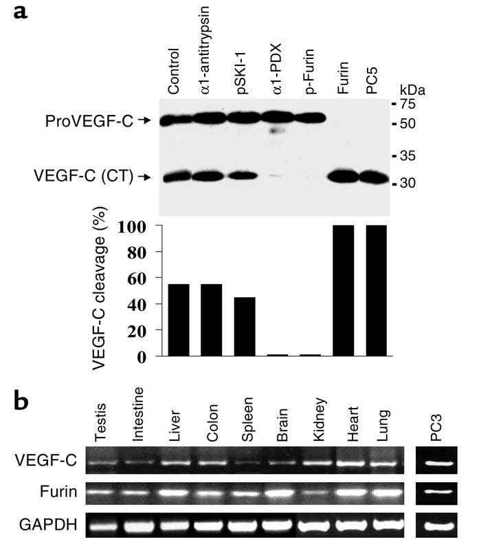 In conclusion, this study demonstrated that FURIN, PC5, and PC7 are the cognate PCs implicated in the dibasic cleavage and activation of proVEGF-C at the dibasic ArgArg227, and underlined the importance of this processing in VEGF-C–mediated functions. In this context, inhibition of the PC-mediated processing of proVEGF-C may provide a novel potential strategy in cancer therapy, in conjunction with other approaches such as using a soluble VEGFR-3 extracellular domain to inhibit tumor angiogenesis and lymphangiogenesis. VEGF-C expression has been detected in 50% of all the human cancers analyzed, and its expression has been correlated with lymph node dissemination in human cancers.