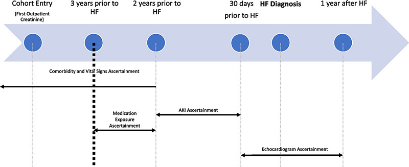 Ascertainment timeline. Time periods of ascertainment of baseline conditions, vital signs, medications, and exposure (AKI events) in relation to outcome (HF diagnosis date). Echocardiogram used to classify HF as HFpEF or HFrEF ascertained in 30 days before and up to 1 year following HF diagnosis date