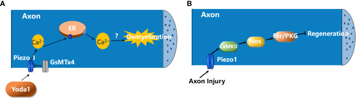 The roles of Piezo1 in demyelination and axon degeneration. (A) The activation of Piezo1 channels in axon negatively regulates CNS myelination. The activation of Piezo1 channels in axon by Yoda1 promotes the influx of extracellular Ca2+ into the neuron which, in turn, triggers Ca2+-induced Ca2+ release (CICR) from ER. This contributes to the demyelination of CNS axons. GsMTx4 blocks Piezo1 activity and prevents the demyelination (57). (B) Piezo1 activation inhibits axon regeneration. Upon axon injury, Piezo1 is recruited to the growth cones and inhibits axon regeneration via the CaMKII-Nos-PKG pathway (58).