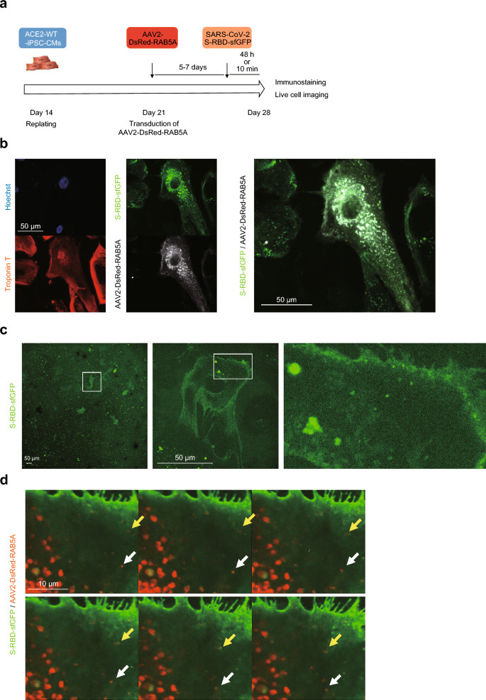Live cell imaging of the endocytosis of SARS-CoV-2 S-RBD-sfGFP in the iPSC-CMs. (a) Time course of immunostaining and live cell imaging after replating the iPSC-CMs. Differentiated cardiomyocytes were replated on day 14 after differentiation and transduced with AAV2-DsRed-RAB5A at 1.0–2.0 × 104 vg/cell on day 21, then incubated with SARS-CoV-2 S-RBD-sfGFP for 48 h before immunostaining or 10 min before live cell imaging on day 28 after differentiation. (b) ACE2-WT-iPSC-CMs transduced with AAV2 encoding DsRed-RAB5A were incubated with SARS-CoV-2 S-RBD-sfGFP for 48 h before immunostaining on day 28 after differentiation with the indicated antibodies. (c) ACE2-WT-iPSC-CMs were incubated with SARS-CoV-2 S-RBD-sfGFP for 10 min before live-cell imaging on day 28 after differentiation and observed by confocal microscopy. The areas enclosed within the white squares are enlarged in the right panel. (d) ACE2-WT-iPSC-CMs transduced with AAV2 encoding DsRed-RAB5A were incubated with SARS-CoV-2 S-RBD-sfGFP for 10 min before live-cell imaging on day 28 after differentiation and observed by confocal microscopy. Each dot indicated by a white or yellow arrow shows the same signal of S-RBD-sfGFP co-localized with AAV2-DsRed-RAB5A.