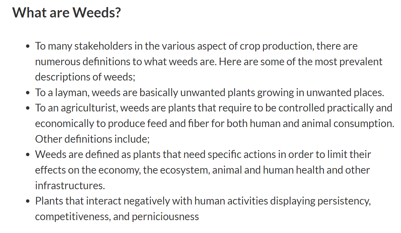 First, of course, systemic herbicides are used to kill WEEDS. What, then, pray tell, is a WEED? Well, what follows is a good summation. I leave it to the reader to extrapolate other “definitions.”