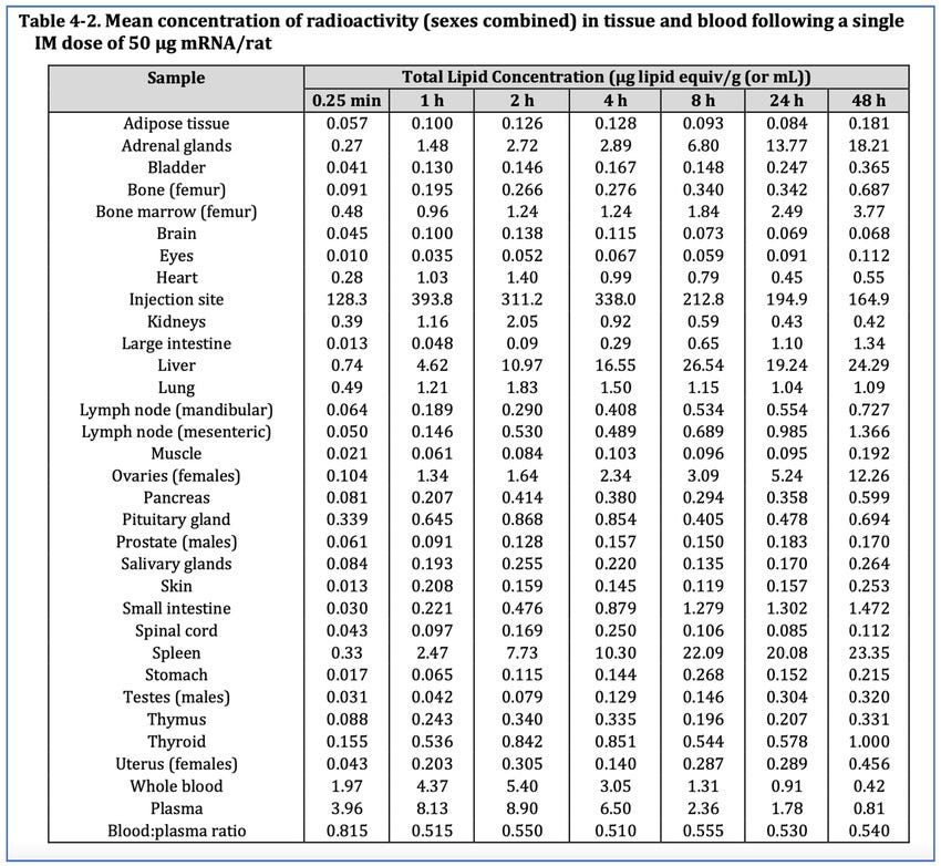 Biodistribution of lipid-nanoparticle in rat, Pfizer study November 2020. From TGA FOI reply 2389-6 [5] (p. 45).