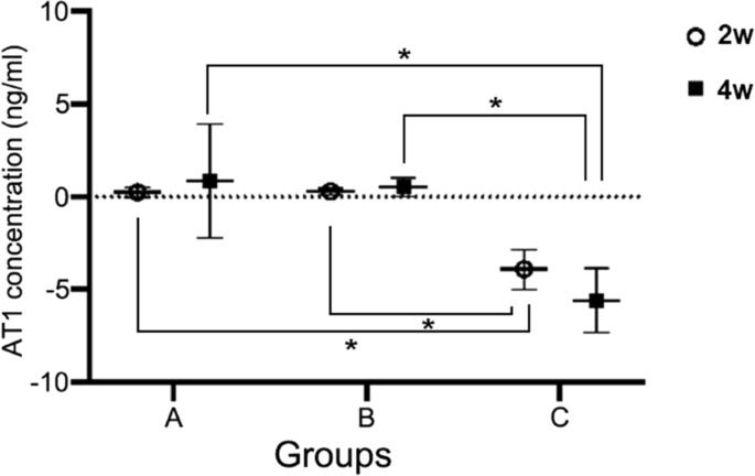 The changes of AT1 concentrations in the testes of normal C57BL/6 mice (A), RAB mice (B), and ± AT1KO mice (C) during the second (○) and fourth weeks (□). Error bar indicates the mean ± SD and significances are indicated as ∗ p < 0.01