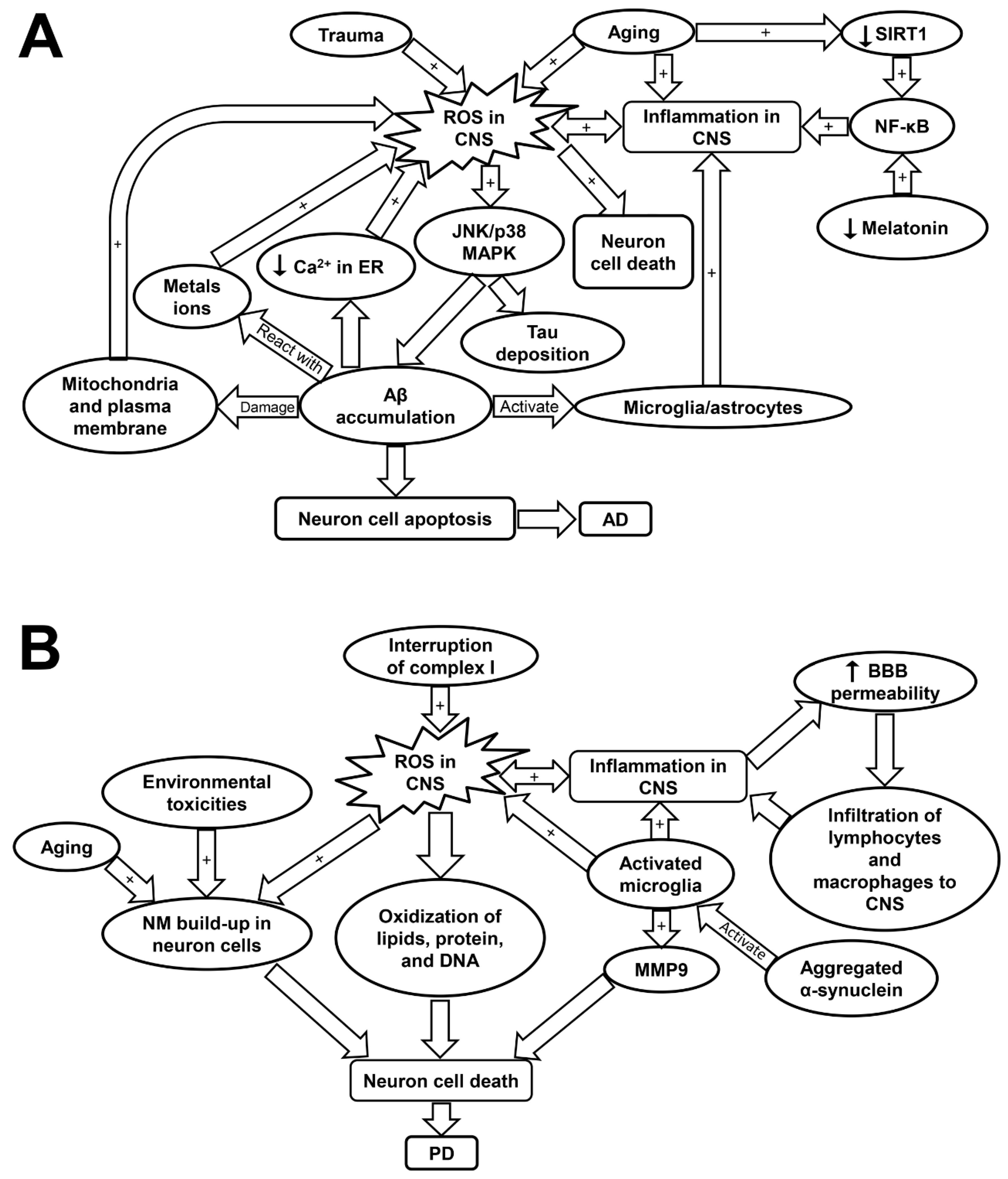 Schematic showing the molecular mechanisms underlying Alzheimer’s disease (A) and Parkinson’s disease (B). AD, Alzheimer’s disease; Aβ, amyloid beta plaques; BBB, blood brain barrier; CNS, central nervous system; JNK/p38 MAPK, c-Jun N-terminal kinase/p38 mitogen-activated protein kinase; MMP9, matrix metalloprotease 9; NF-κB, nuclear factor kappa-light-chain-enhancer of activated B; PD, Parkinson’s disease; ROS, reactive oxygen species; SIRT1, sirtuin-1.
