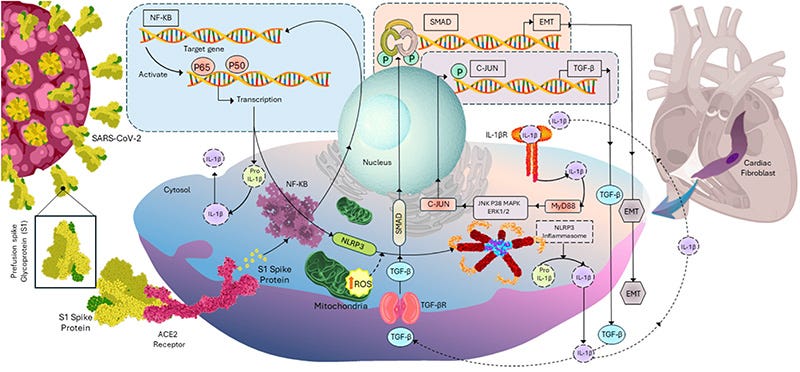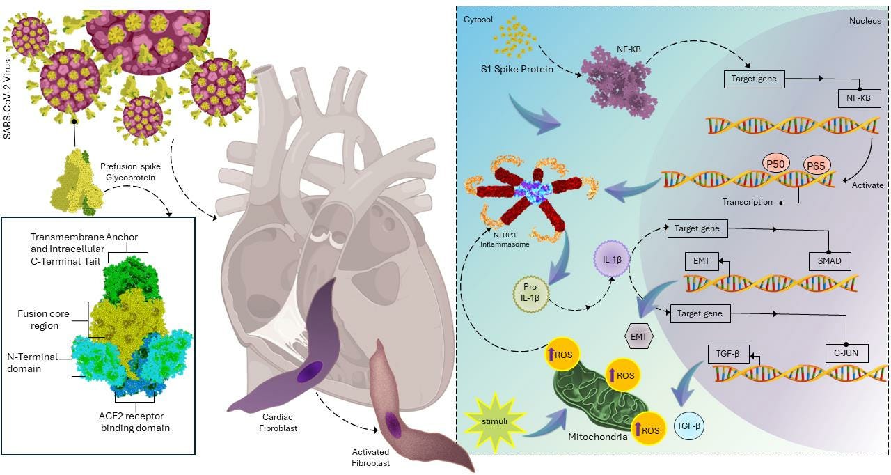 As readers of this Substack know, I have long hypothesized and warned that the Spike Protein of SARS-CoV-2 induces systemic fibrosis. This has been proven in a paper published yesterday in Cells. It found that the fibrosis is triggered in precisely the way I hypothesized it would be – paralleling radiation. The Spike Protein activates the NLRP3/Nf-KB inflammasome inducing ECM synthesis.