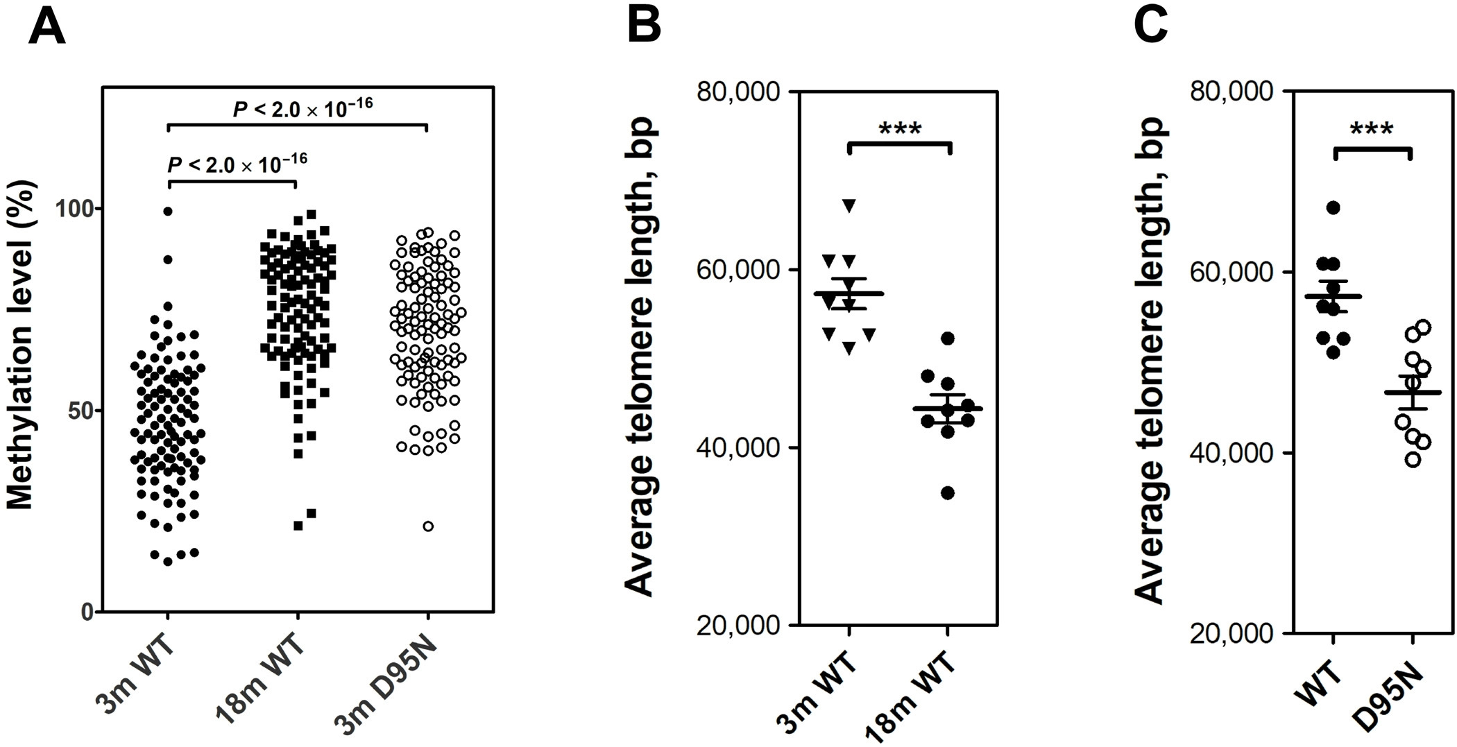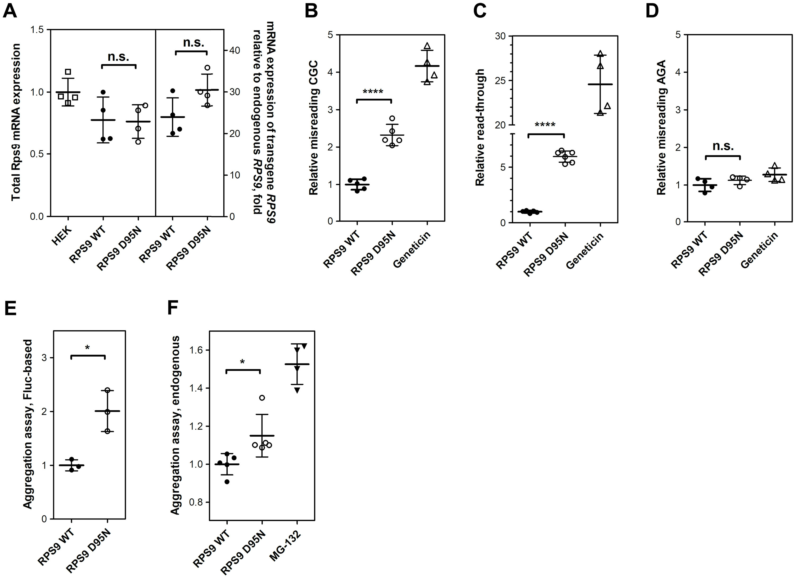 Here, we show that Rps9 D95N knock-in mice exhibit reduced life span and a premature onset of numerous aging-related phenotypes, such as reduced weight, chest deformation, hunchback posture, poor fur condition, and urinary syndrome, together with lymphopenia, increased levels of reactive oxygen species–inflicted damage, accelerated age-related changes in DNA methylation, and telomere attrition.